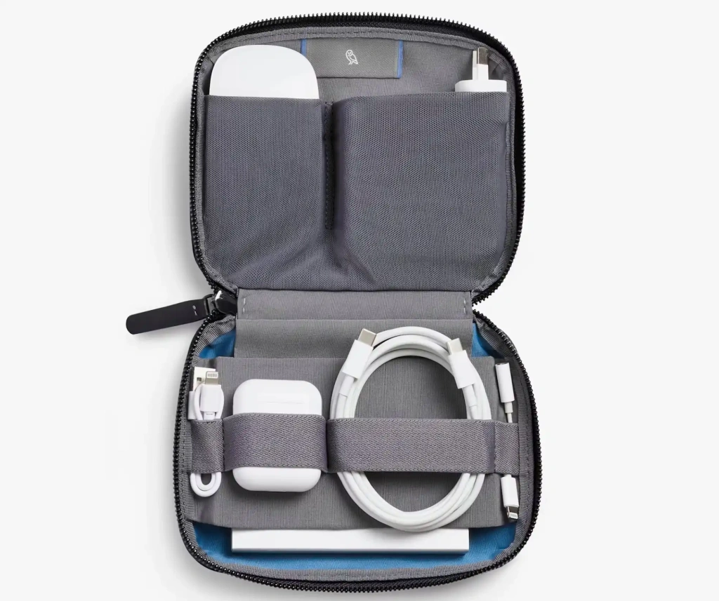 - Bellroy Tech Kit. Альтернативный вариант с местом для проводов, зарядного устройства и других атрибутов. Внутри — эластичные петли для кабелей, сетчатые карманы и магнитный карман для пауэрбанка.