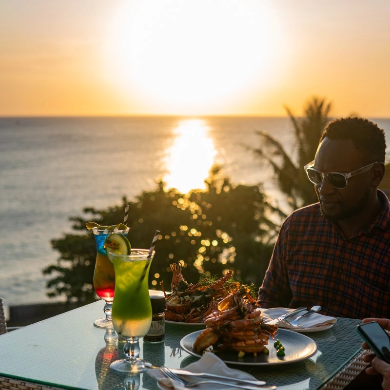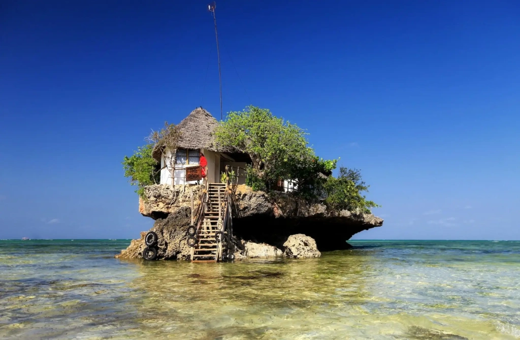 - The Rock Restaurant в деревне Мичамви Пингве (восточный берег полуострова Мичамви): главная местная гастрономическая достопримечательность – ресторан на небольшой скале прямо в океане. Приливы и отливы на Занзибаре на некоторых пляжах существенные, поэтому в период, когда вода прибывает, до ресторана приходится плыть на небольшой лодке, а в отлив – можно дойти пешком по песку. В меню свежайшие морепродукты, в том числе осьминоги, лобстеры, тунец и королевские креветки, приготовленные на гриле. Обеденный сет обойдется в $60–80, а ужин с вином – в $90–120 на человека.