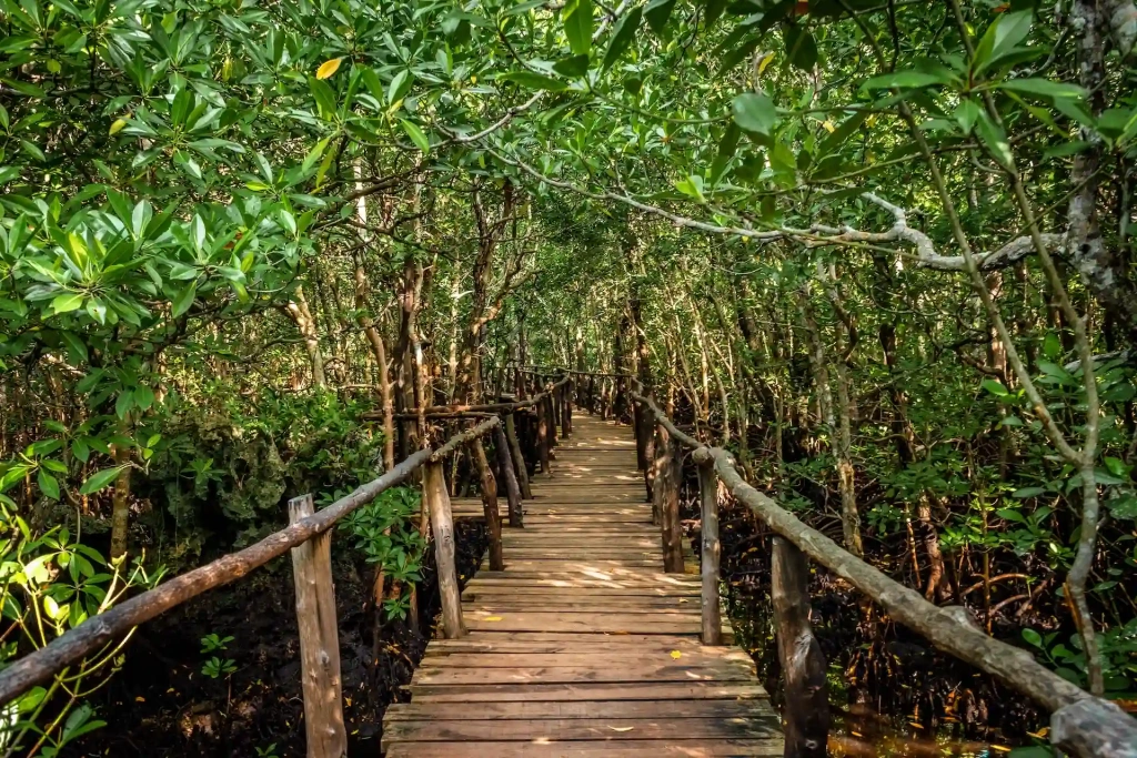 Завершает экскурсию прогулка по деревянным настилам через мангровые болота. Это самая необычная часть путешествия. Вокруг тонкие запутанные корни мангров, под ногами вода, а рядом с тропой можно заметить редких тропических птиц.