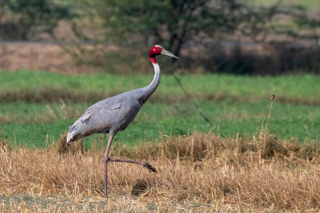Индийский журавль (он же сарус) — самая высокая летающая птица в мире: рост взрослых особей достигает 1,8 метра. Ее можно узнать по светло-серому окрасу, розовым лапам и красной коже на голове. Обитает в Индии, Непале, Камбодже, Мьянме и Вьетнаме. Предпочитает болота, затопленные луга и рисовые поля. Основу рациона составляют растения, а также лягушки, рыбы, насекомые и рептилии.