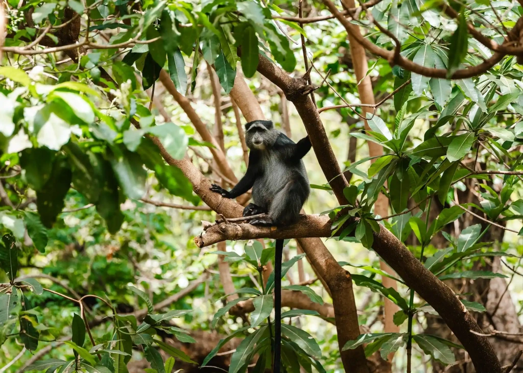 Черно‑белый колобус — редкий вид примата, обитающий в основном в кронах деревьев. Он редко спускается на землю и отлично приспособлен к древесному образу жизни. Черный окрас с белыми участками в области плеч, спины, морды и хвоста помогает удачно прятаться среди листвы.