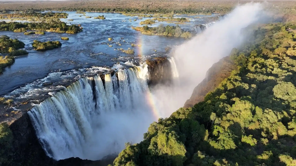 Высота водопада — около 108 метров, но куда интереснее его ширина. Здесь река Замбези стекает через утес почти на 1 708 метров по горизонтали, создавая широкую полосу воды — самый большой водяной занавес в мире. Во время сезона дождей огромные потоки образуют плотный туман, видимый на десятки километров вокруг. При этом масштаб водопада позволяет наблюдать его сразу с нескольких точек — с берега, утесов напротив и с воздуха.